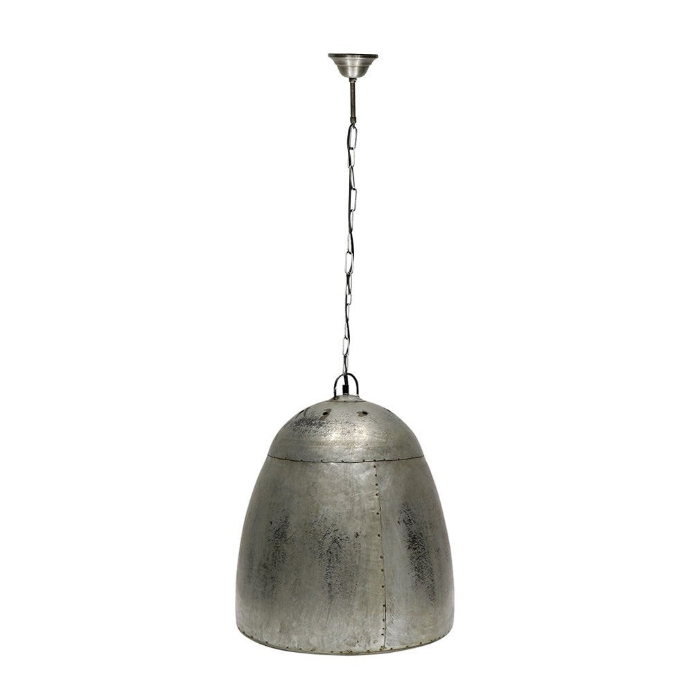 A vintage style, distressed metal, dome shaped pendant featuring an industrial riveted seam, metal chain and matching ceiling rose.