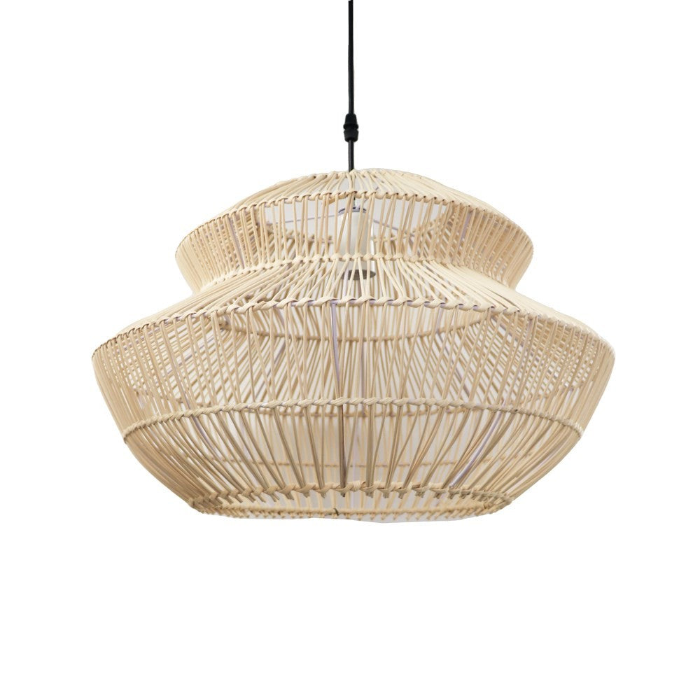 Vertical strips of rattan have been cleverly cinched in at the waist to create a stepped effect to this pendant. Looking wonderful lit and creating a warm ambience to any room.